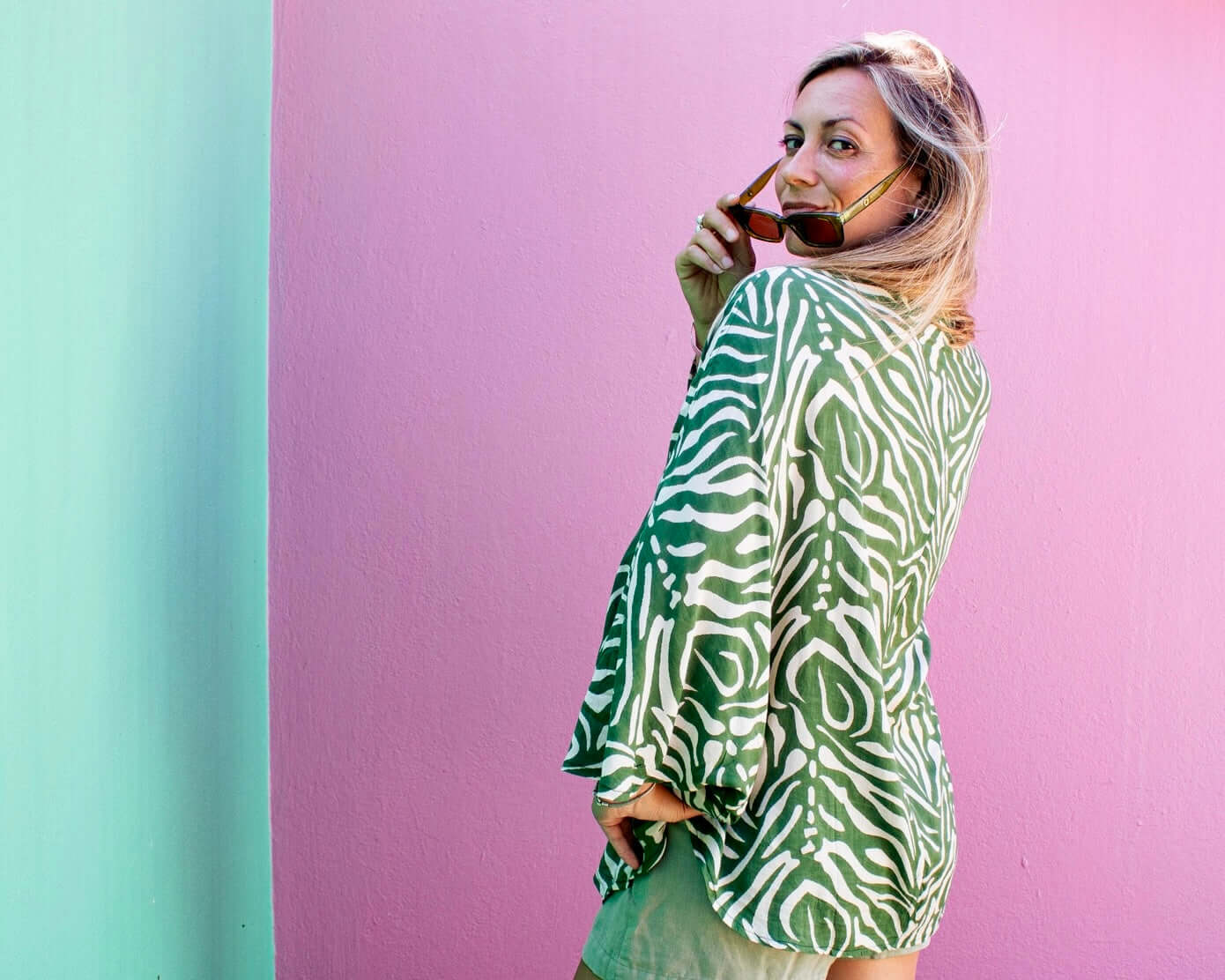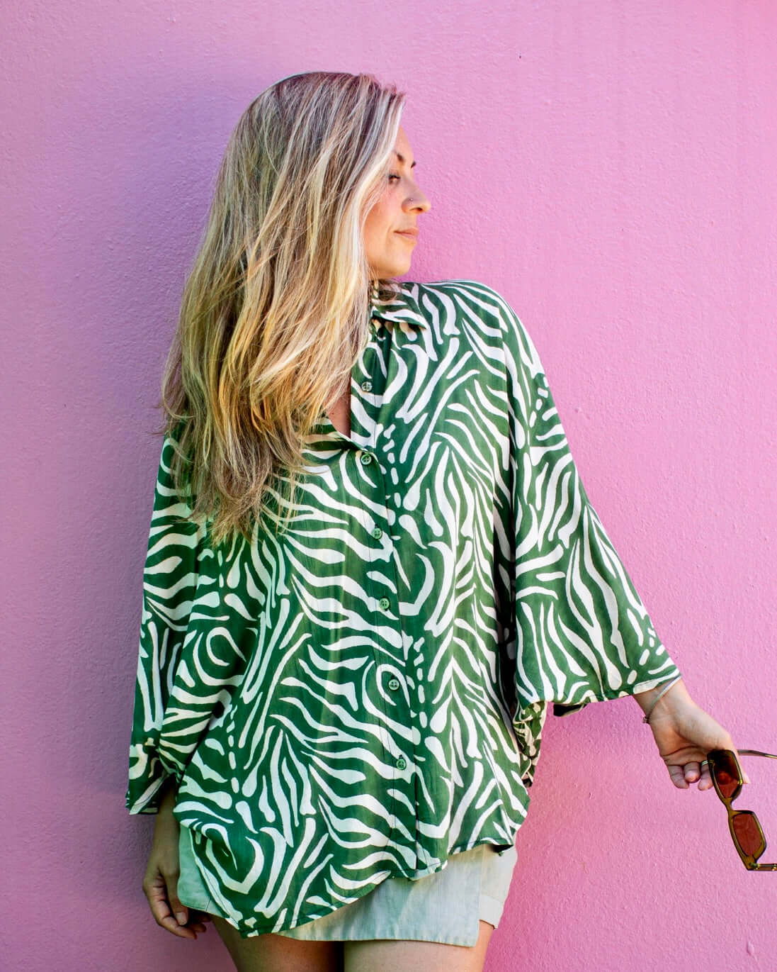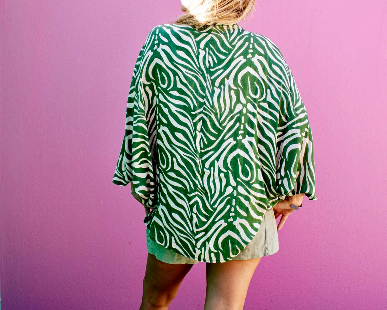 The Forest print brings bold, organic energy to the Monika fluid shape. With its deep green base and cream zebra-inspired lines, this design strikes the perfect balance between wild expression and sophisticated style. Eye-catching yet wearable, Forest adds movement, depth, and a touch of adventure to your everyday wardrobe.
