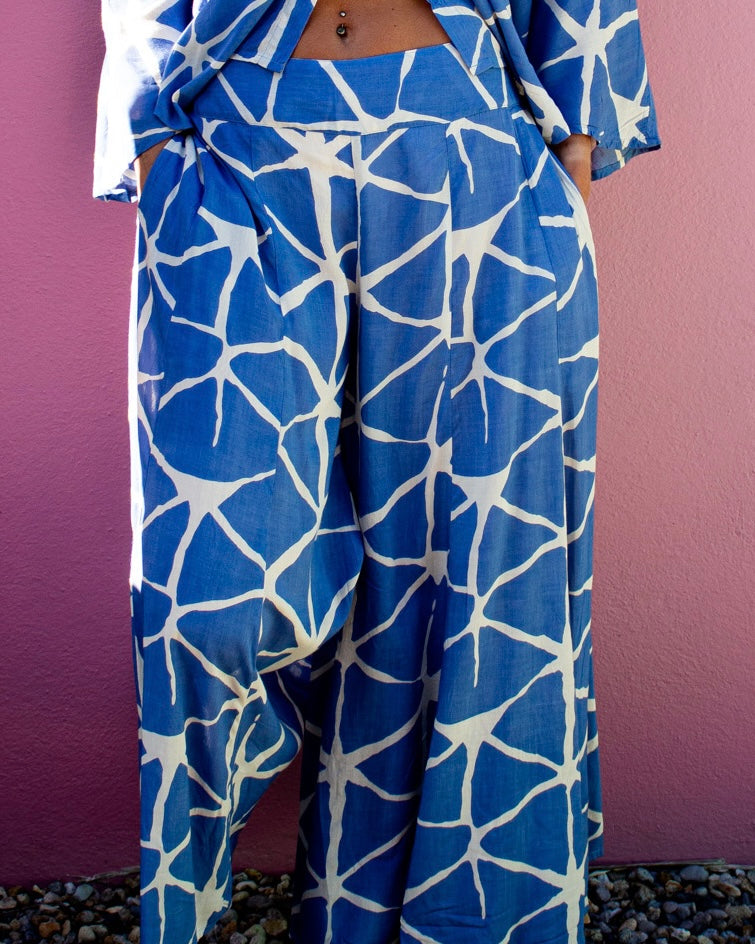 The Sky print brings a fresh, modern feel with its hand-drawn, abstract lines in soft ivory over a serene blue base. The airy pattern enhances the natural movement of the fabric, giving the pants a light, uplifting presence. Effortless yet artistic, it’s a perfect choice for those who love calm tones with a contemporary twist.